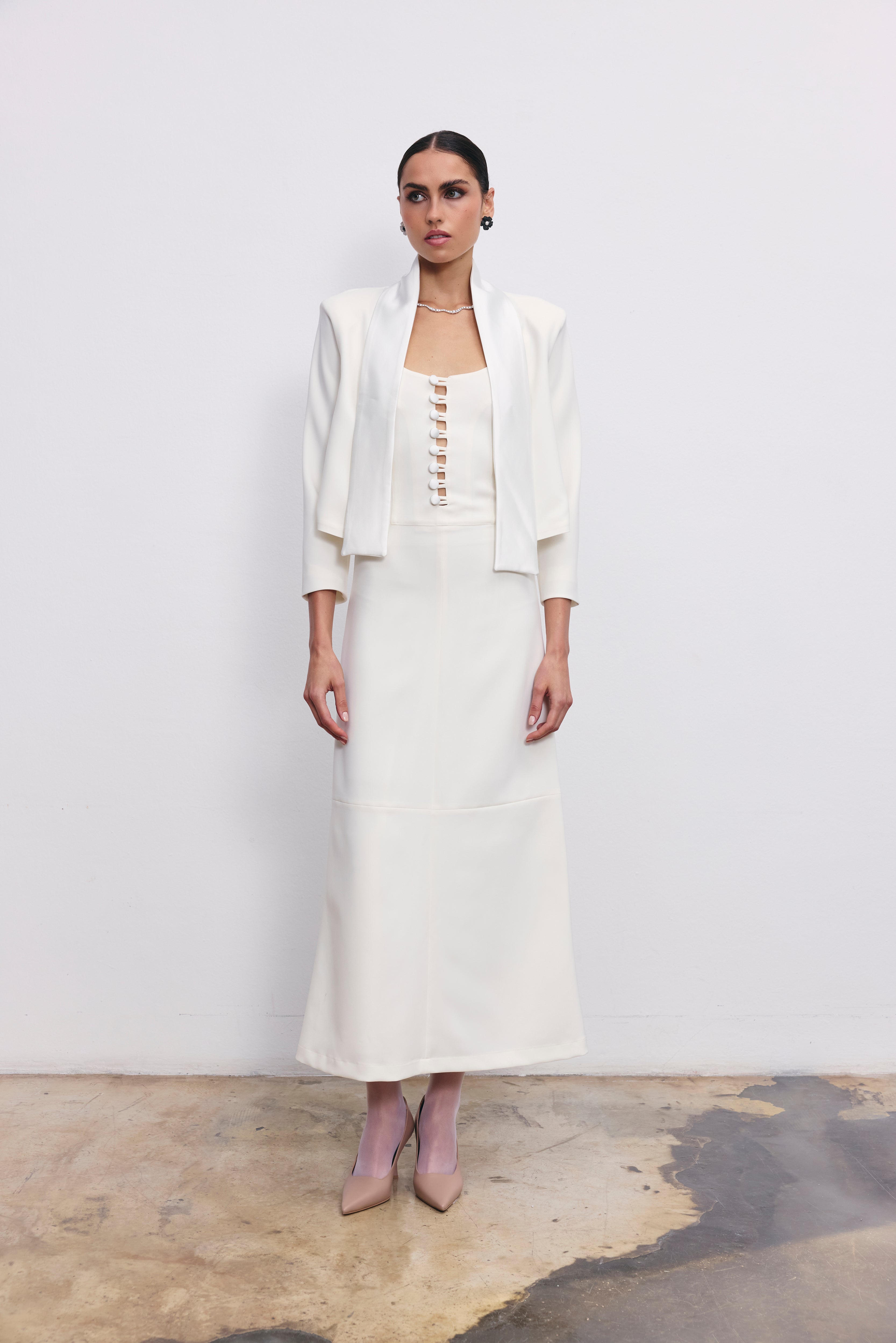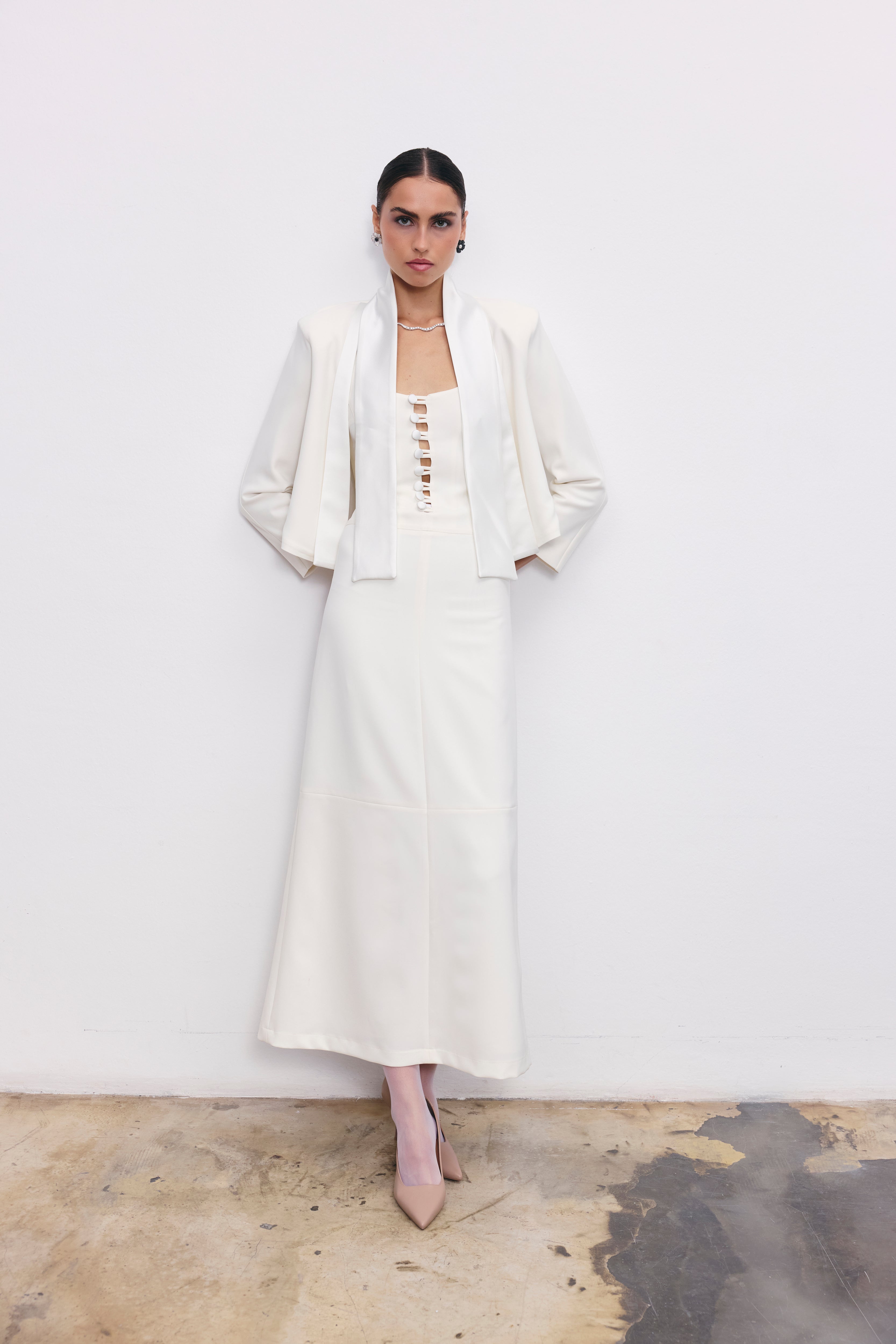 The Emma jacket brings together clean tailoring and a soft crepe satin texture. Featuring a cropped cut and a distinctive shawl-inspired overlay, it adds a graceful finish to any look. Easy to style over dresses or high-waisted trousers.