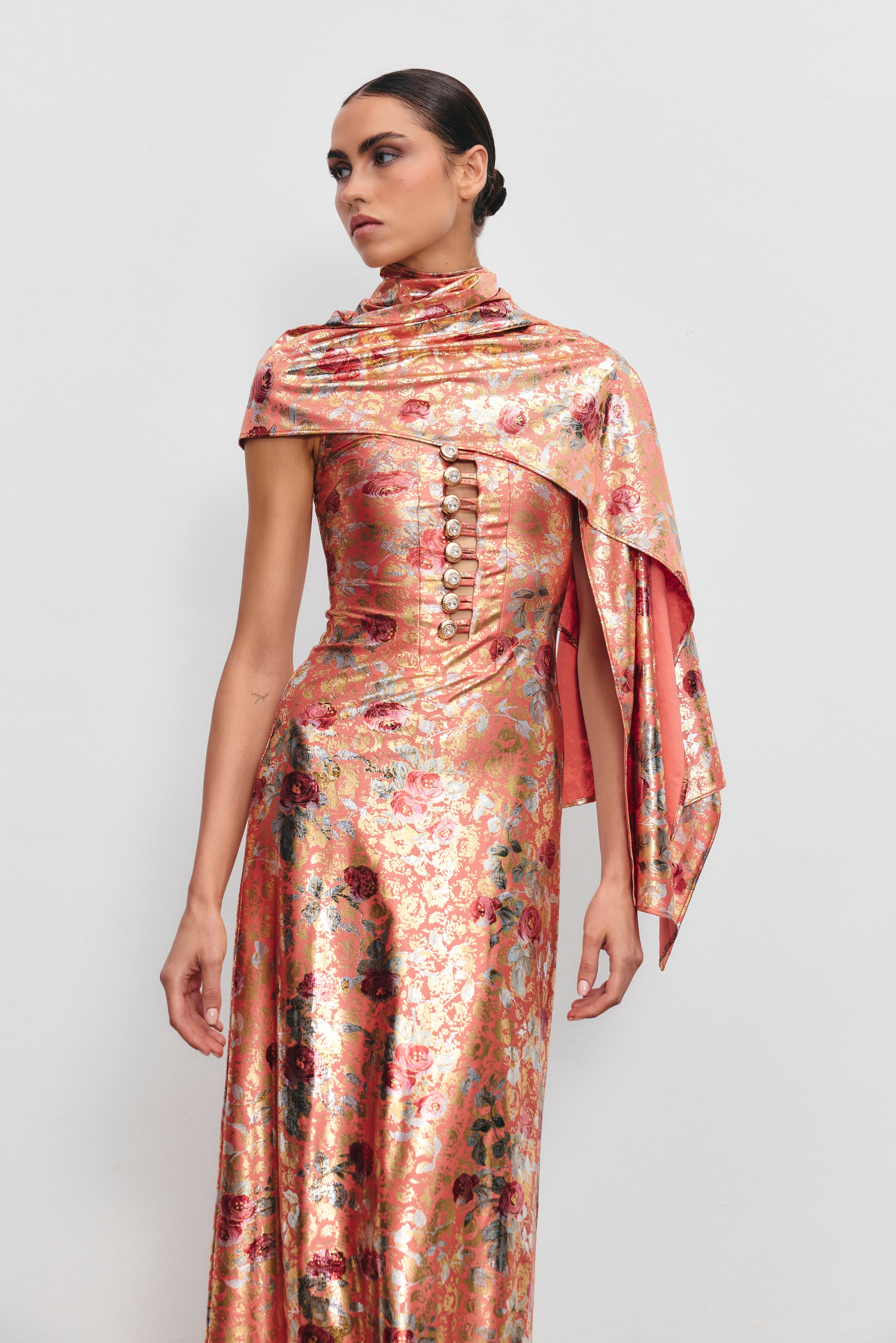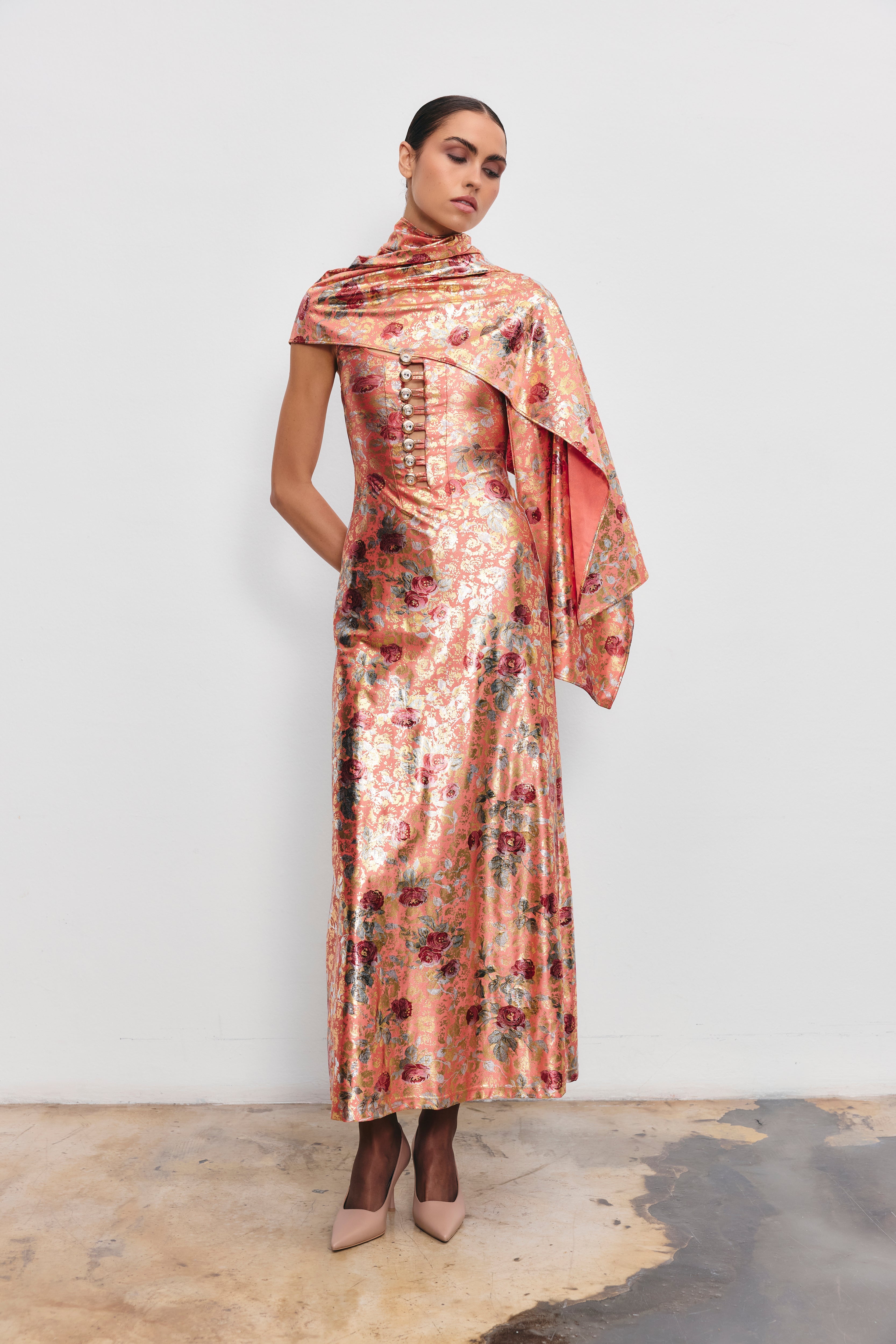 The iconic Be Happy dress is reimagined in a striking new fabric. With its signature pearl button detailing down the front, this maxi-length piece maintains its elegance while standing out with its shimmering, soft texture and modern cut.