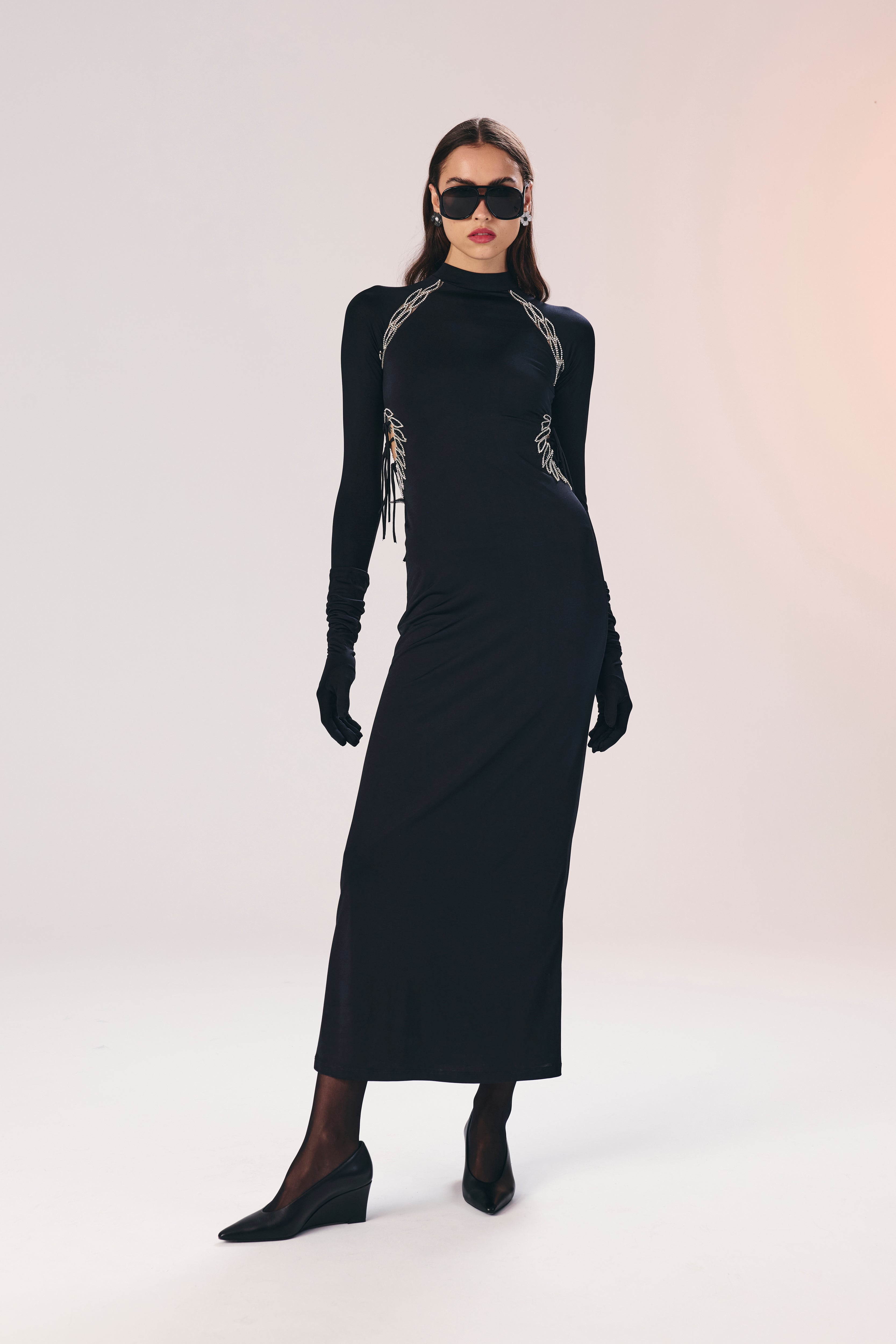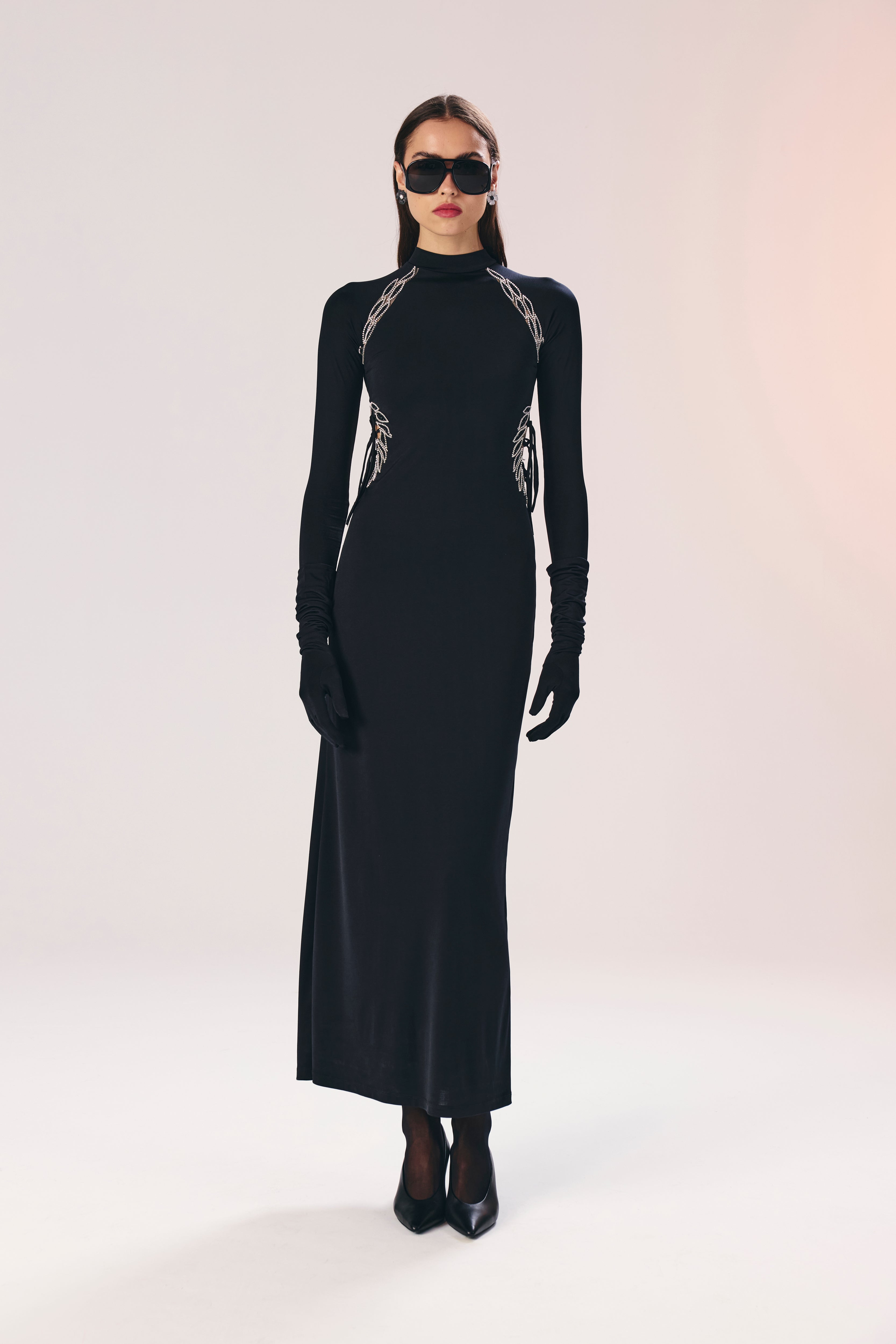 A bold yet refined statement, the Roxanne dress features sparkling embellishments and sculpting jersey comfort. Crystal hand-embellishments trace a delicate path from the shoulders to underarms, while a separate cut-out detail at the waist highlights the silhouette. The long-sleeved, body-skimming shape falls to a clean, floor-length hem — perfect for a confident evening look.