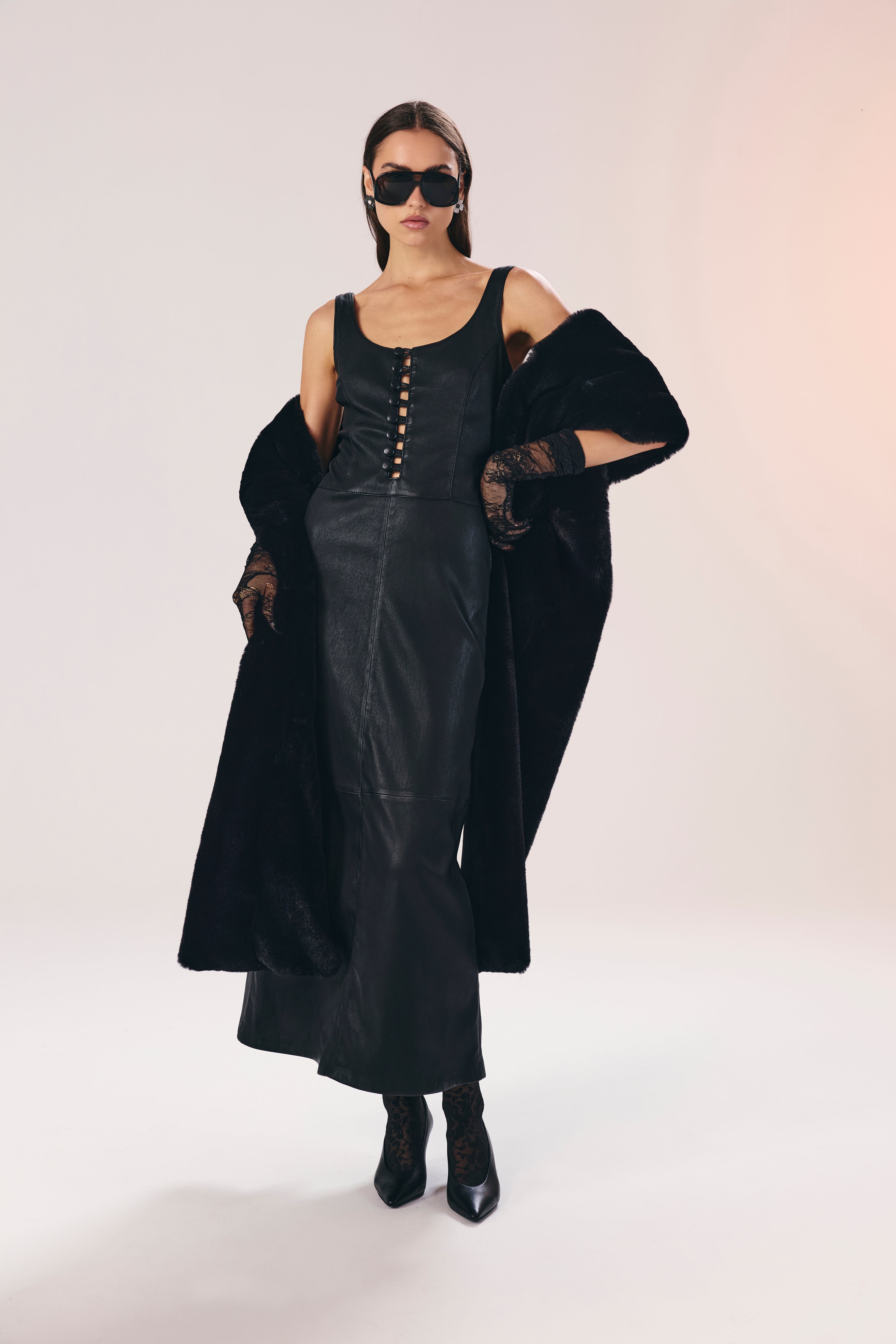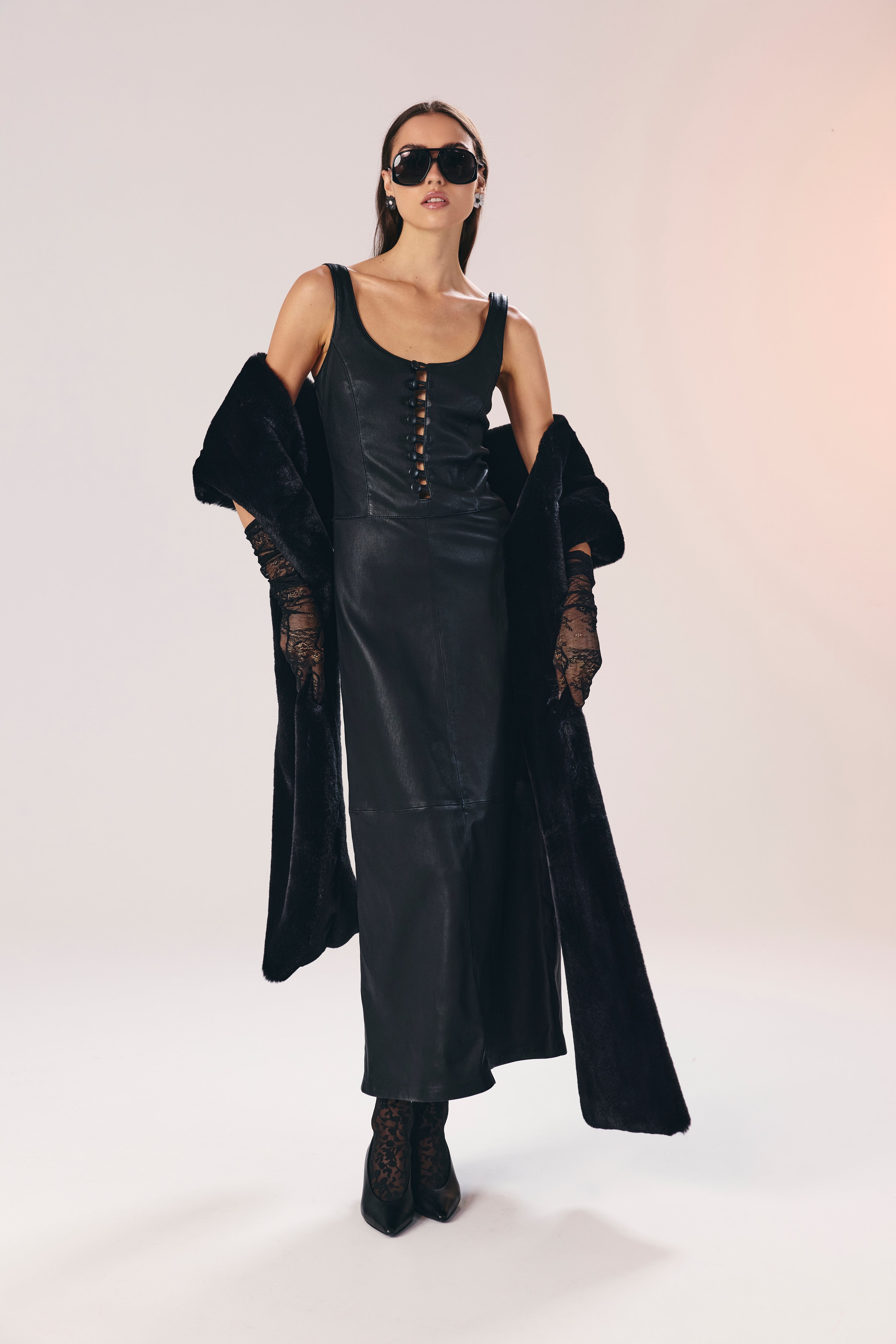 Crafted from 100% lamb leather, this sleeveless dress blends bold confidence with timeless sophistication. Designed in a structured silhouette with a button-embellished front, it hugs the body for a sleek, flattering shape. Perfect to wear alone or layered with a statement coat or blouse.