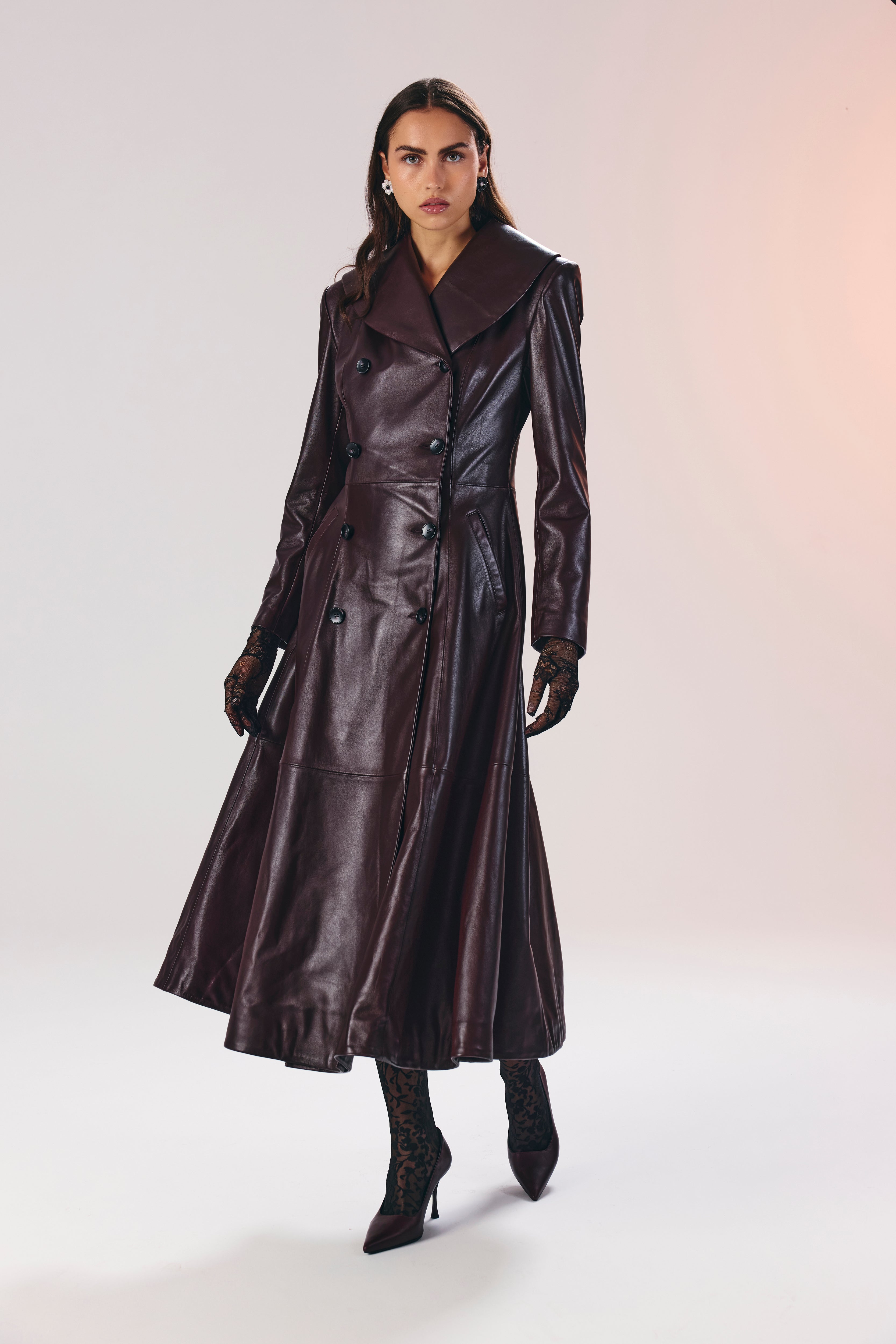 The Estelle coat blends fluid femininity with classic tailoring. Designed in soft burgundy vegan leather, it features a flared A-line hem and wide notched lapels that evoke 1950s charm. A timeless outerwear piece reimagined for today’s woman.
