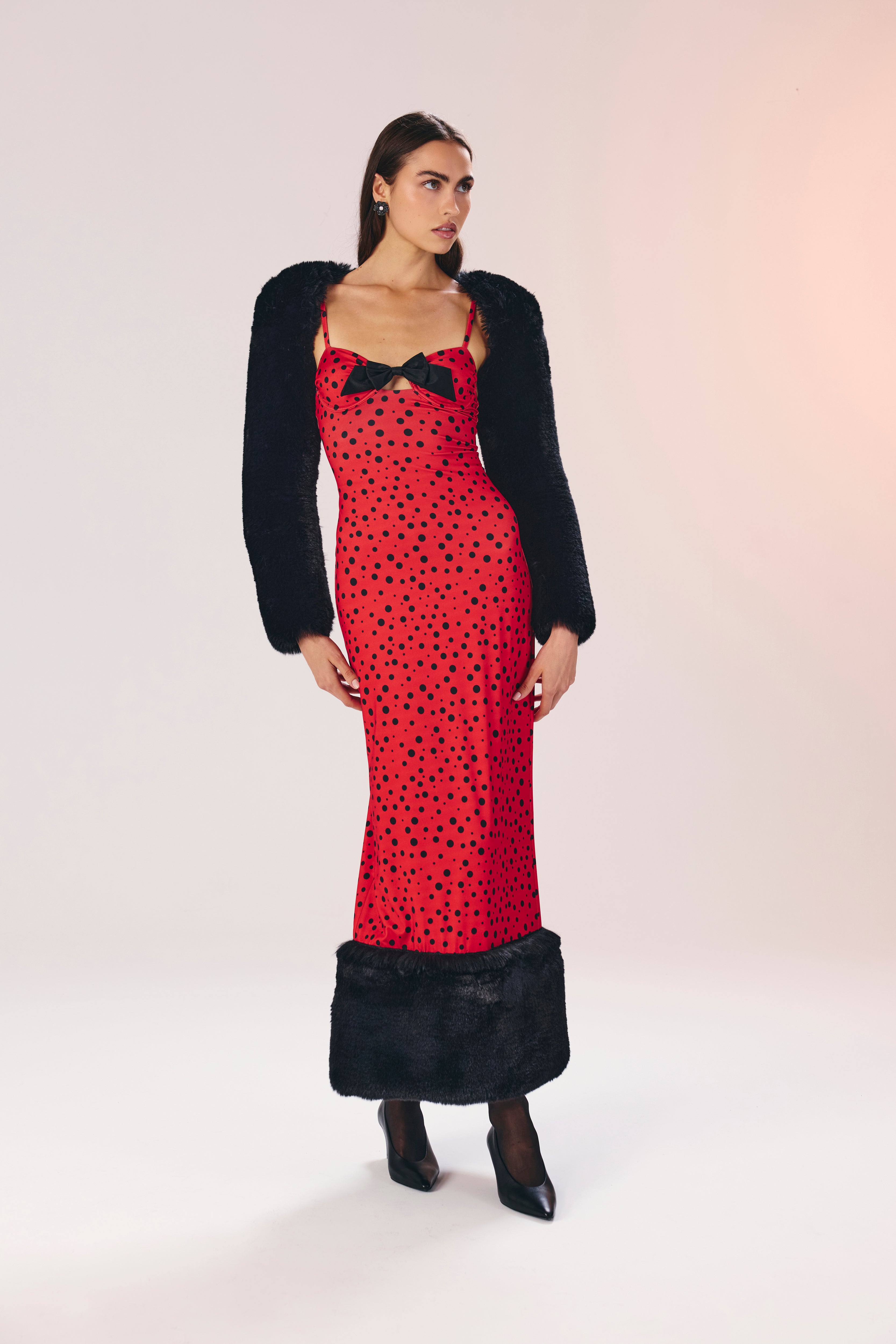 The dramatic hemline trimmed with soft black faux-fur evokes the glamour of old Hollywood, while the stretchy jersey fabric ensures all-day comfort with a retro edge reminiscent of classic polka dots and feminine silhouettes.