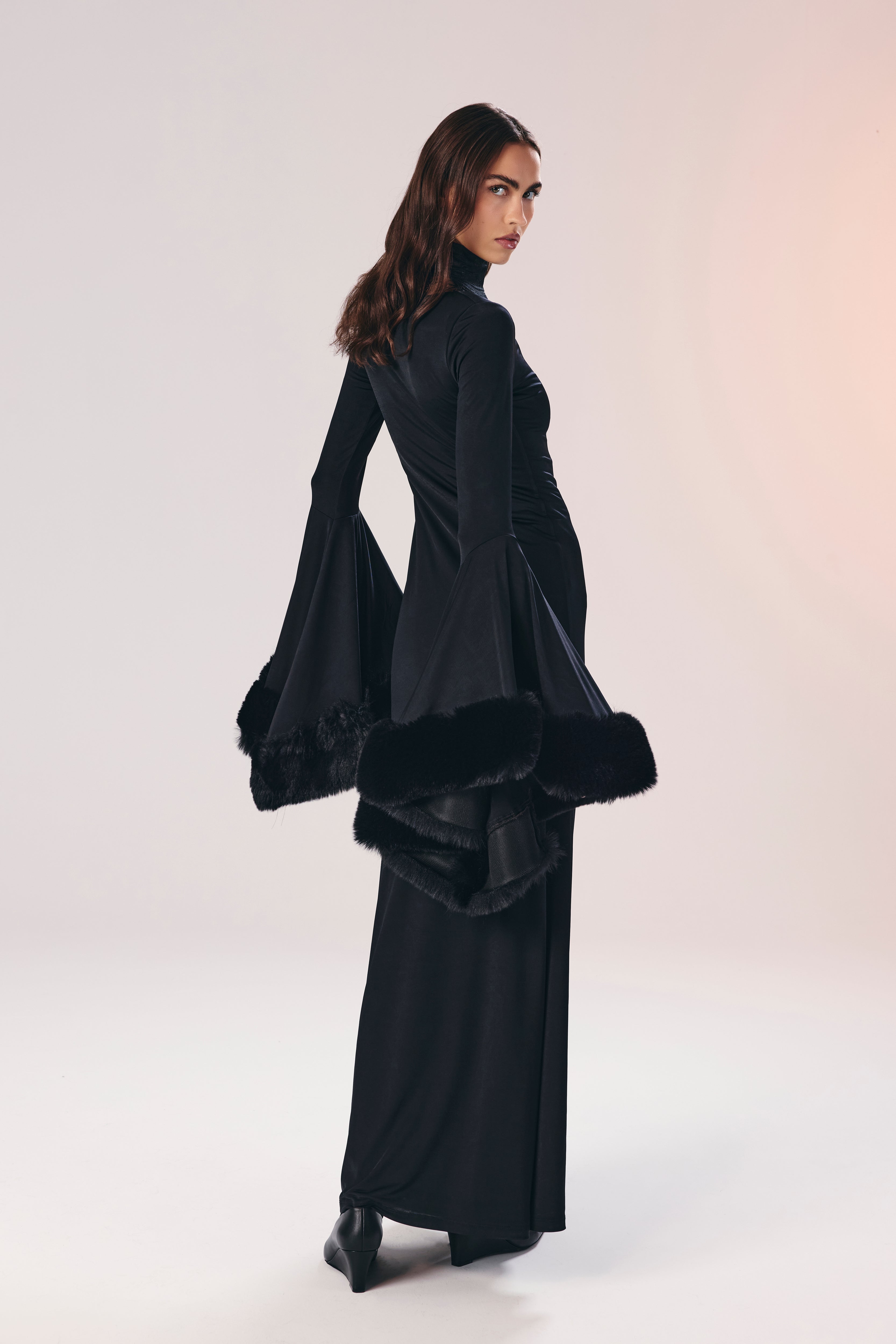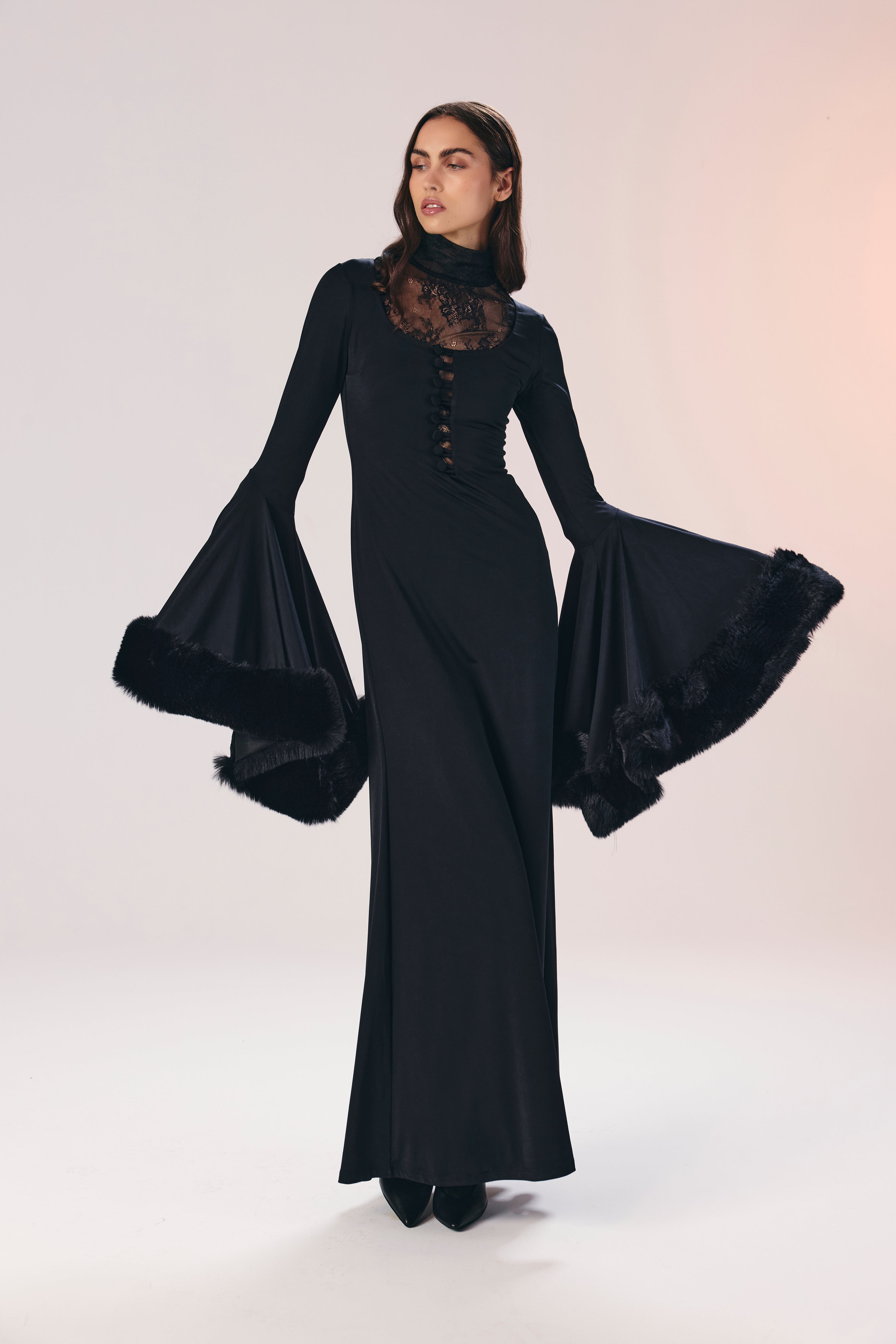 Crafted in fluid jersey, this full-length dress is defined by dramatic bell sleeves trimmed in plush faux fur. Inspired by 1950s glamour, it channels vintage elegance with a modern edge. Self-fabric buttons add refinement to the front, while the seamless construction ensures a smooth, flattering fit that hugs the silhouette beautifully.