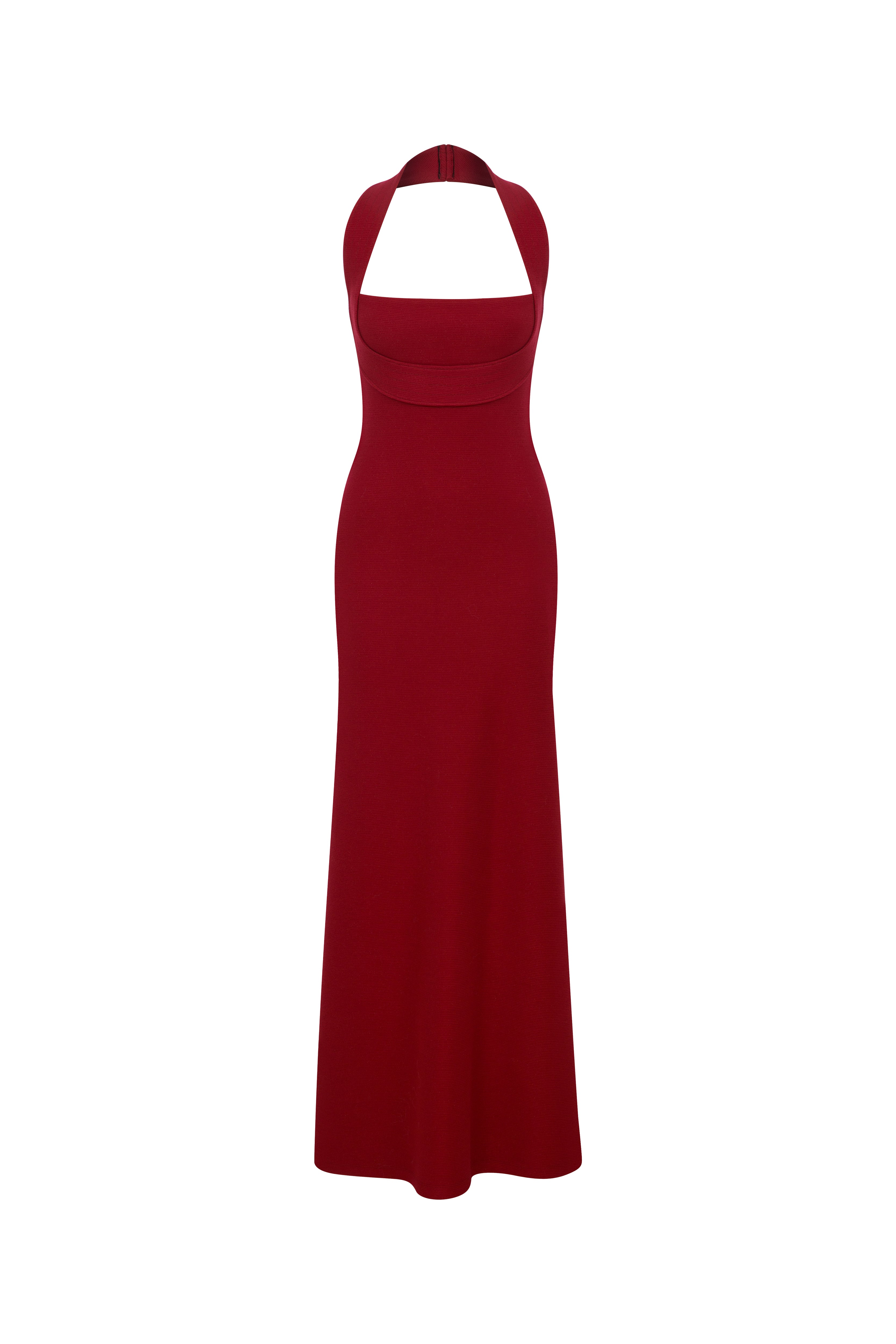 Effortless yet bold — this halter neck maxi dress features a sculpted, strapless-effect bodice designed in a bandage-inspired form for a body-hugging silhouette. Crafted from a smooth viscose-elastane blend, the dress flows seamlessly down the body with clean lines and an elegant finish. Completed with a concealed center-back zipper for a flawless fit and ease of wear.