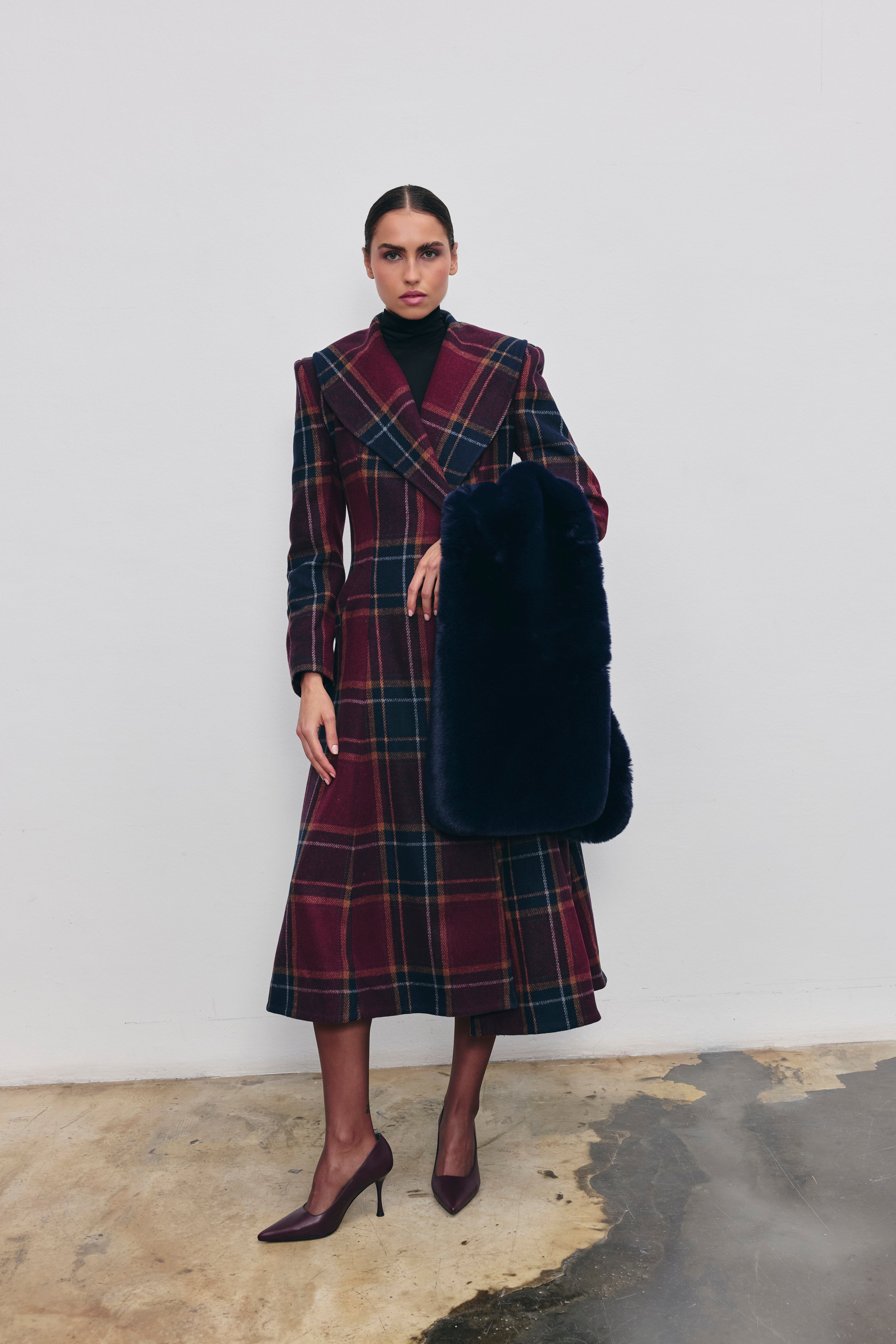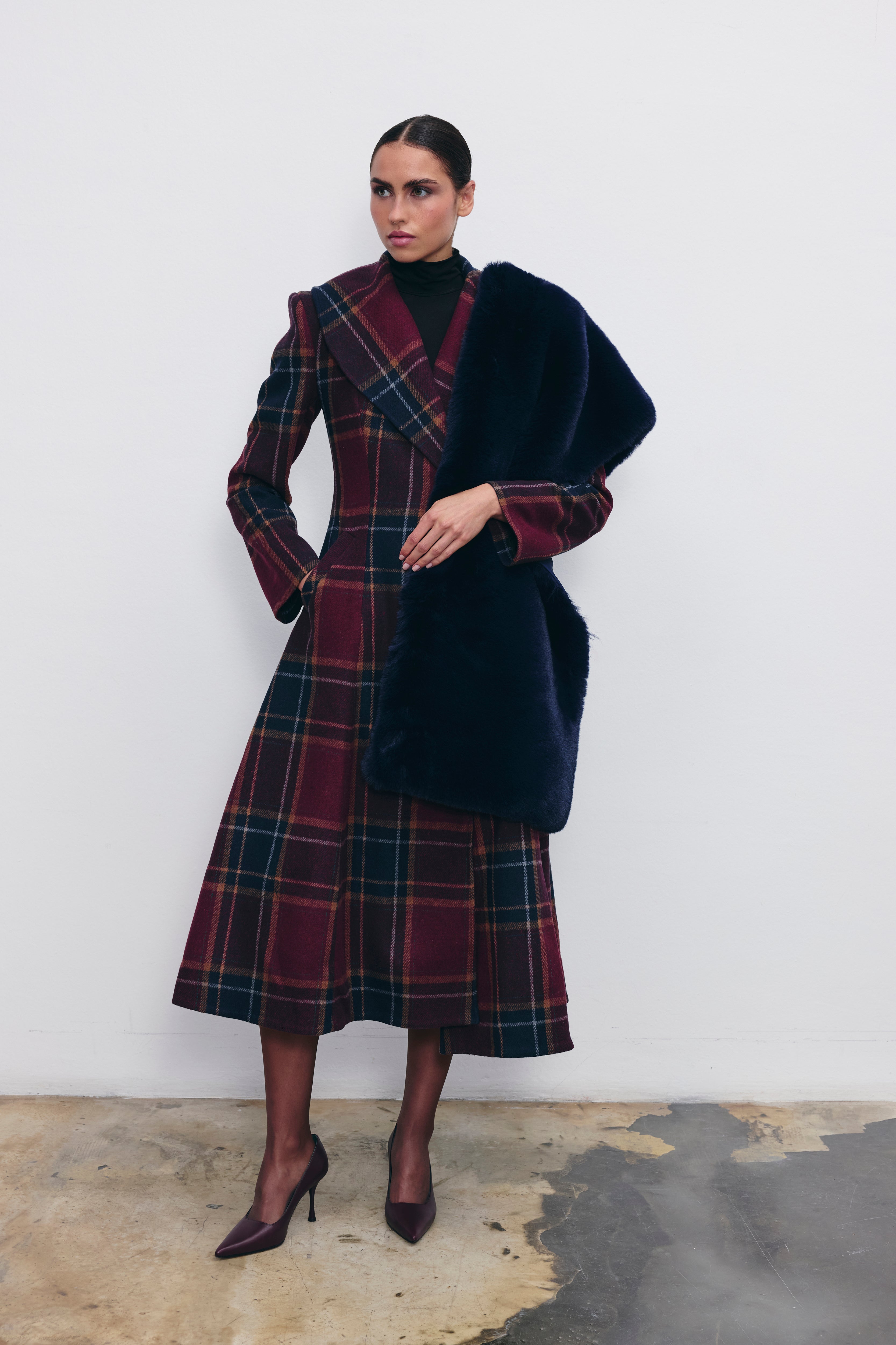 Defined by its strong silhouette and timeless plaid, the Estelle Coat brings elegance and warmth together. Designed in a flattering fit-and-flare cut, this midi-length piece gently hugs the waist with a belted finish—ideal for both city style and special occasions. Its wool-blend texture offers elevated comfort through cooler days.