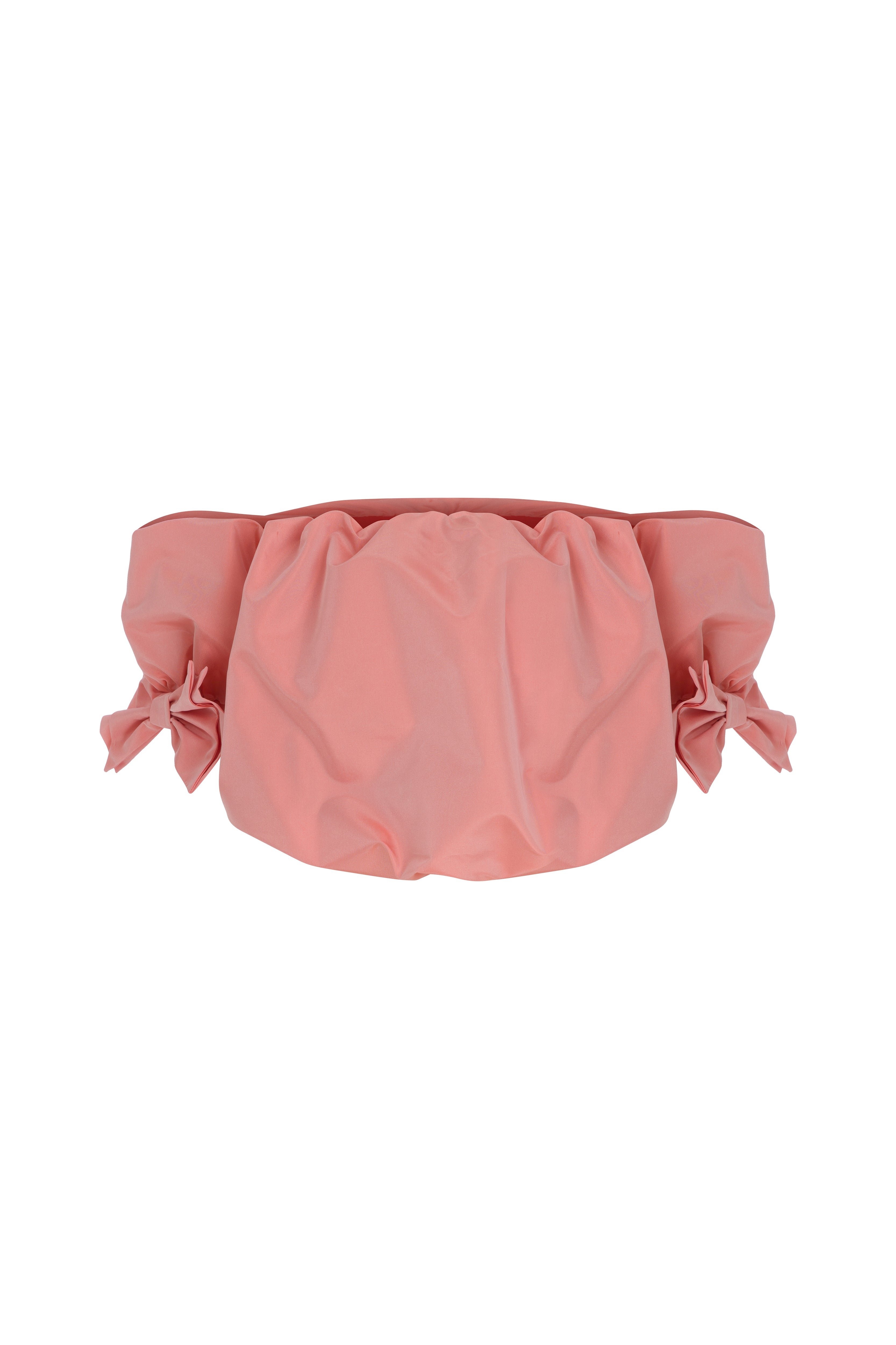 A modern interpretation of volume and femininity. This off-shoulder blouse features a sleek, fitted bust and a dramatic balloon-shaped body that cinches at the waist. The short puff sleeves are gathered and tied with elegant bows, creating a sculptural silhouette that blends boldness with romance.