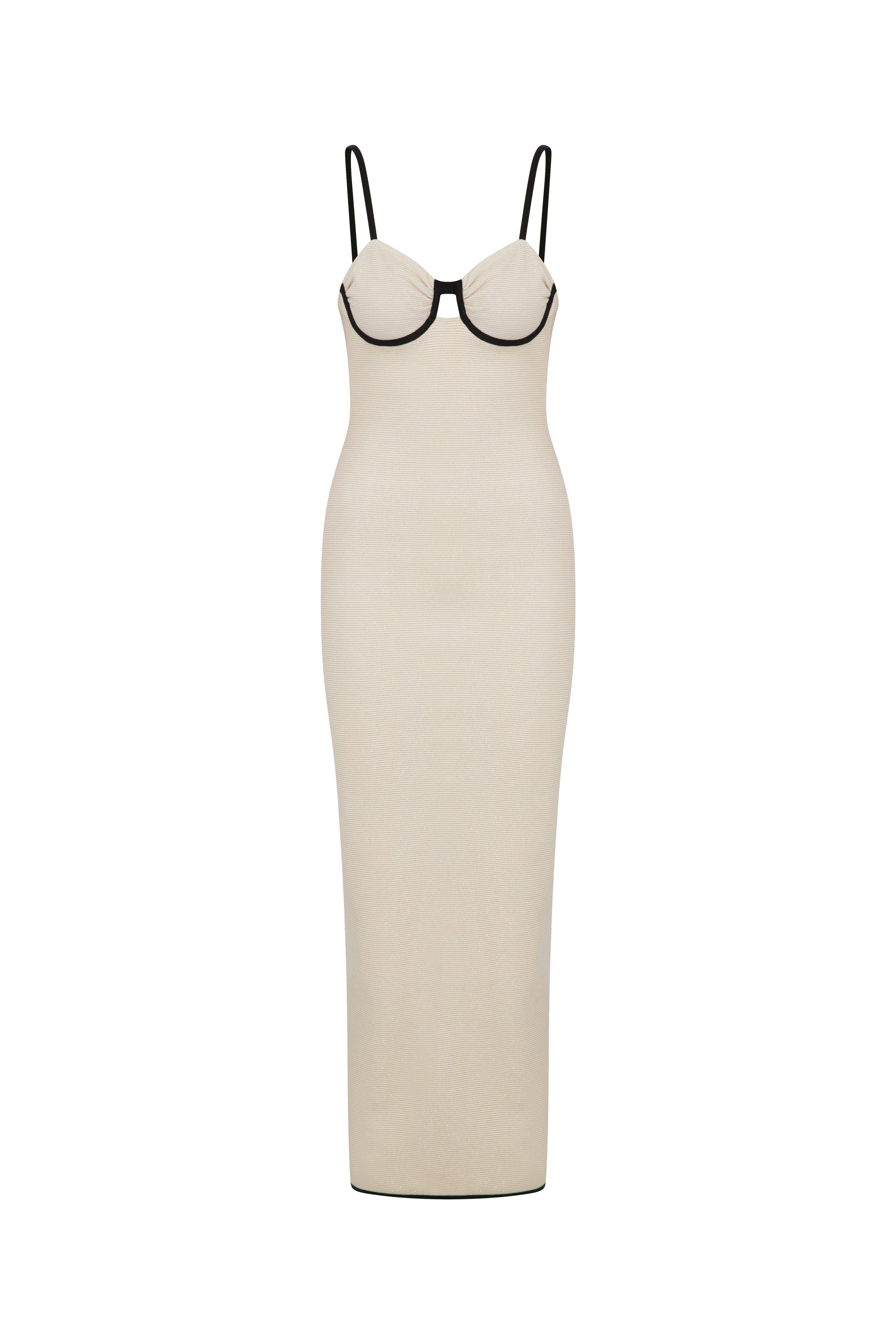 Sculpted elegance meets everyday comfort. The Lutetia dress is crafted from soft stretch knit fabric, hugging the body with precision while offering structure through its underwired bustier neckline. A subtle contrast piping highlights the curves, making this timeless silhouette perfect for both day-to-night occasions.
