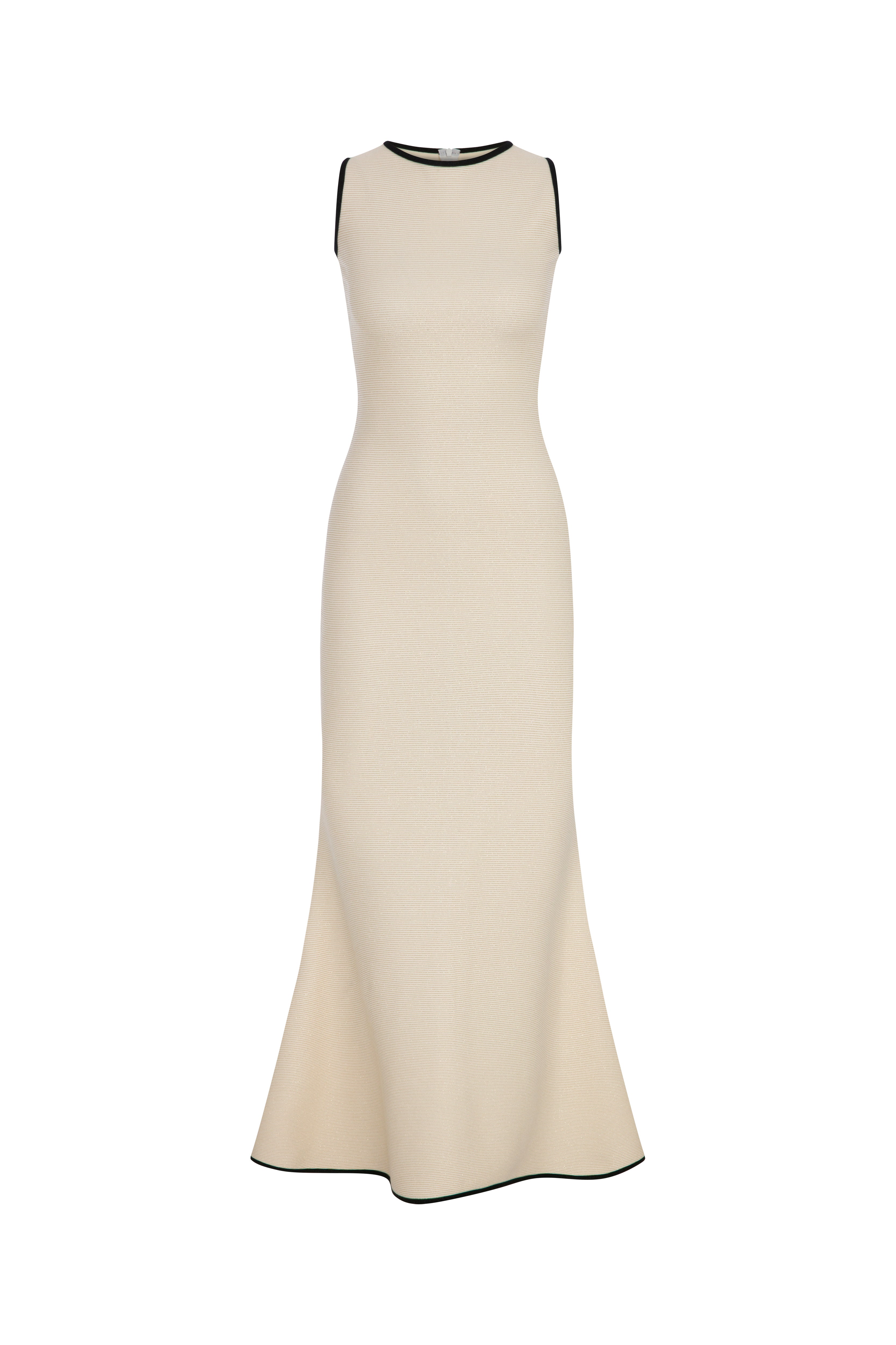 A refined full-length silhouette in breathable ivory knit, elevated with black contrast trims. With its sleek high neckline and body-skimming cut, this sleeveless maxi dress blends timeless elegance with modern ease.