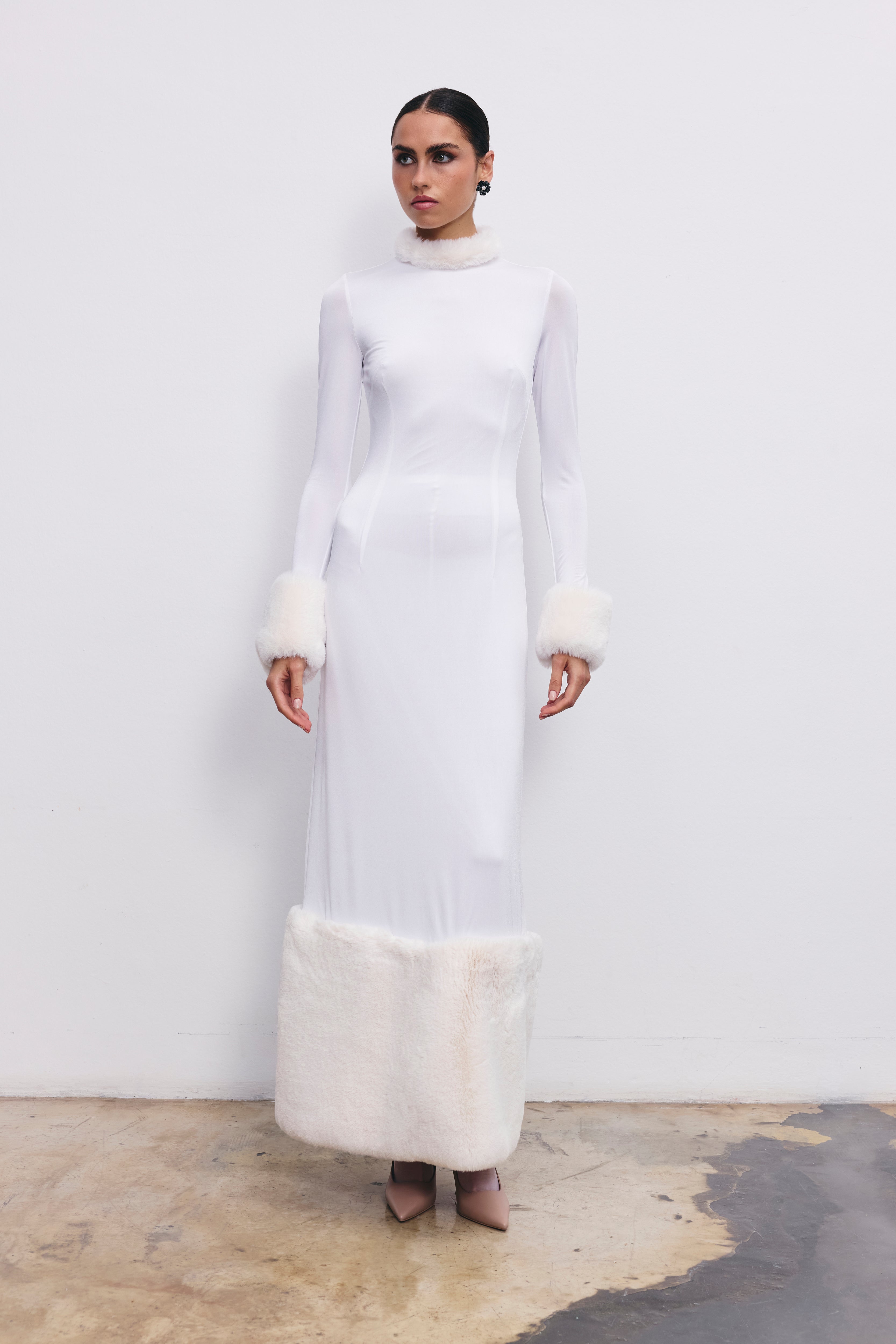 Blending timeless elegance with minimalist charm, this white maxi dress is defined by its clean silhouette and soft faux-fur trim at the hem. Featuring a mock neckline and body-hugging stretch fabric, it’s both effortlessly chic and comfortable to wear.