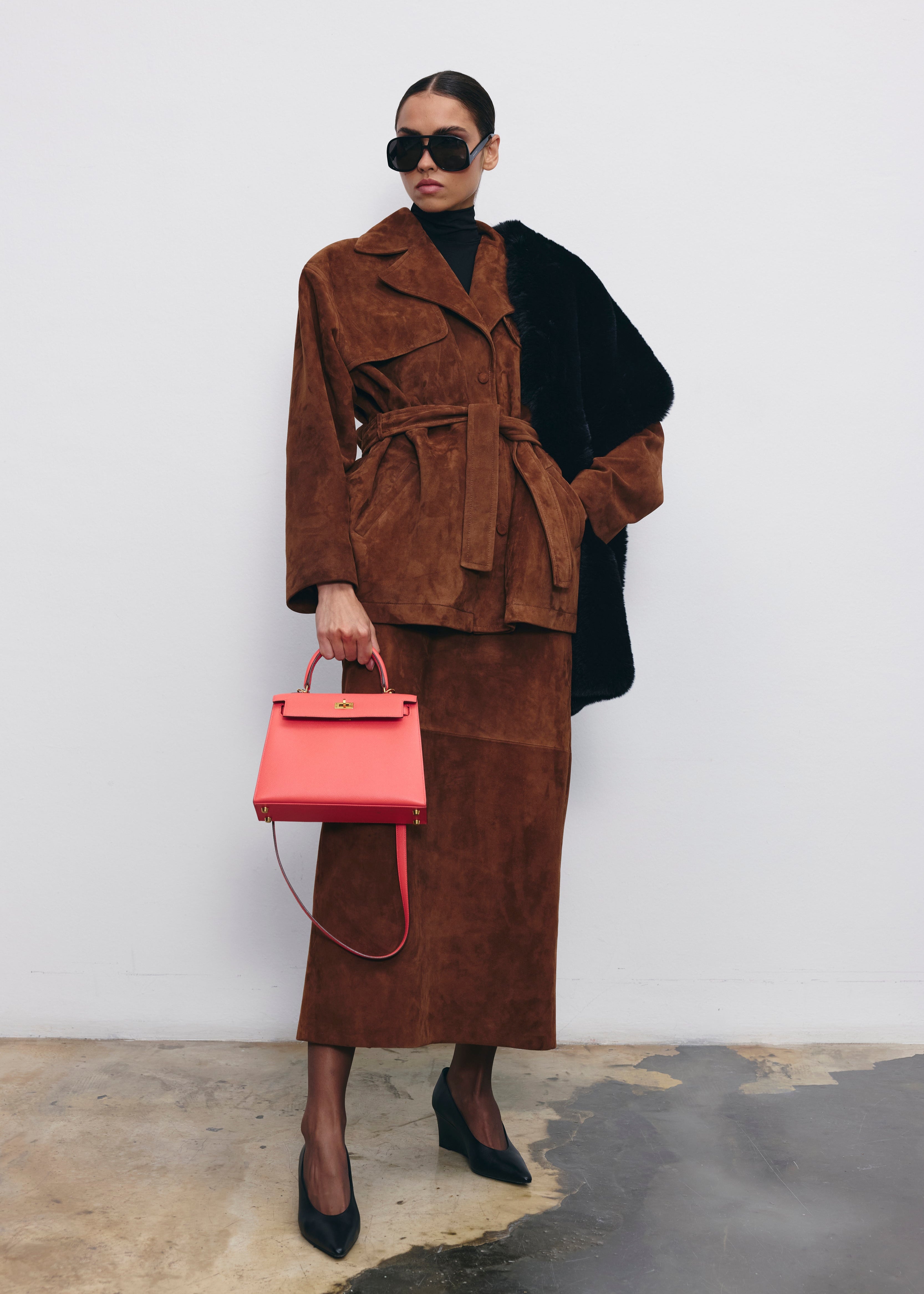 A standout piece from the collection, the Madeleine jacket is crafted from 100% genuine suede. With structured shoulders, a belted waist, and full lining, it combines elegance with utility. Its warm milk-chocolate tone adds timeless sophistication to your wardrobe.